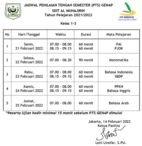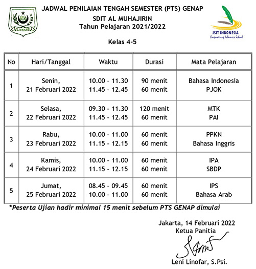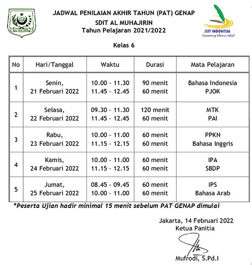 Jadwal Penilaian Tengah Semester (PTS) Genap dan Penilaian Akhir Tahun (PAT) TP. 2021-2022 SDIT Al Muhajirin
